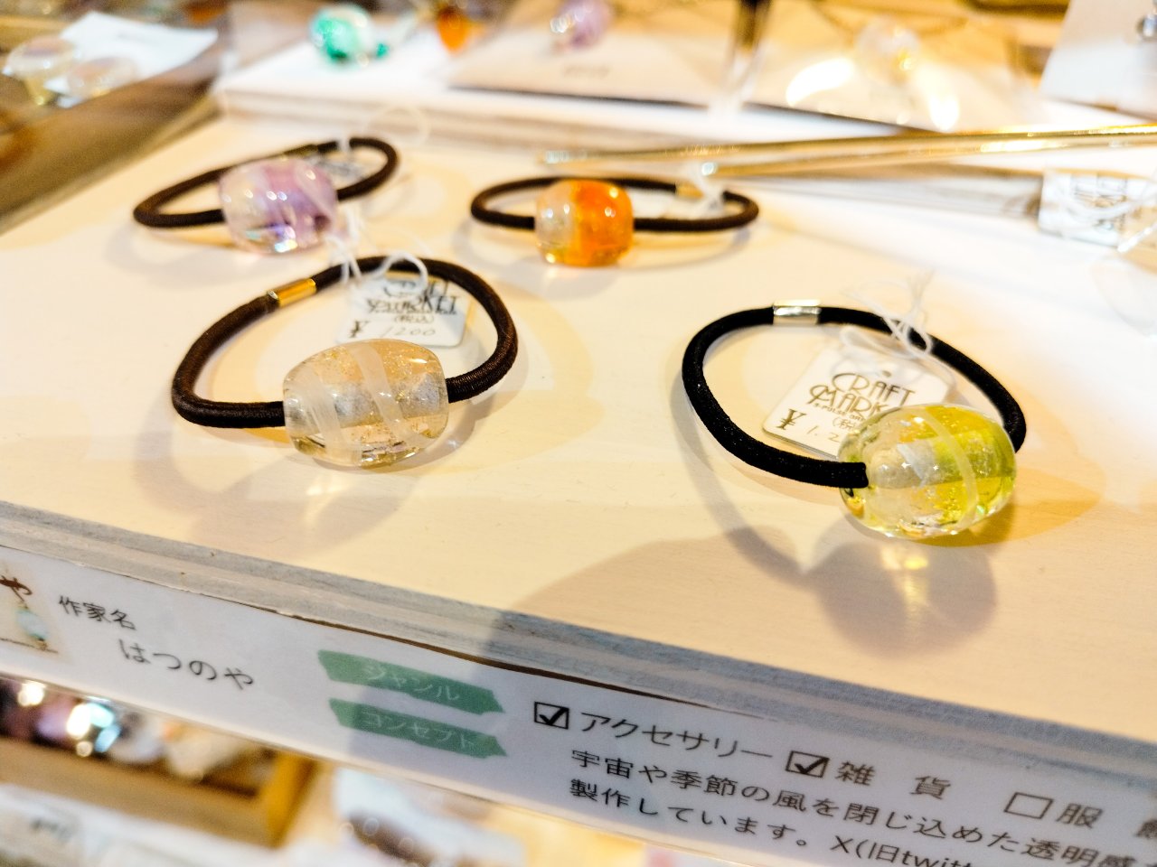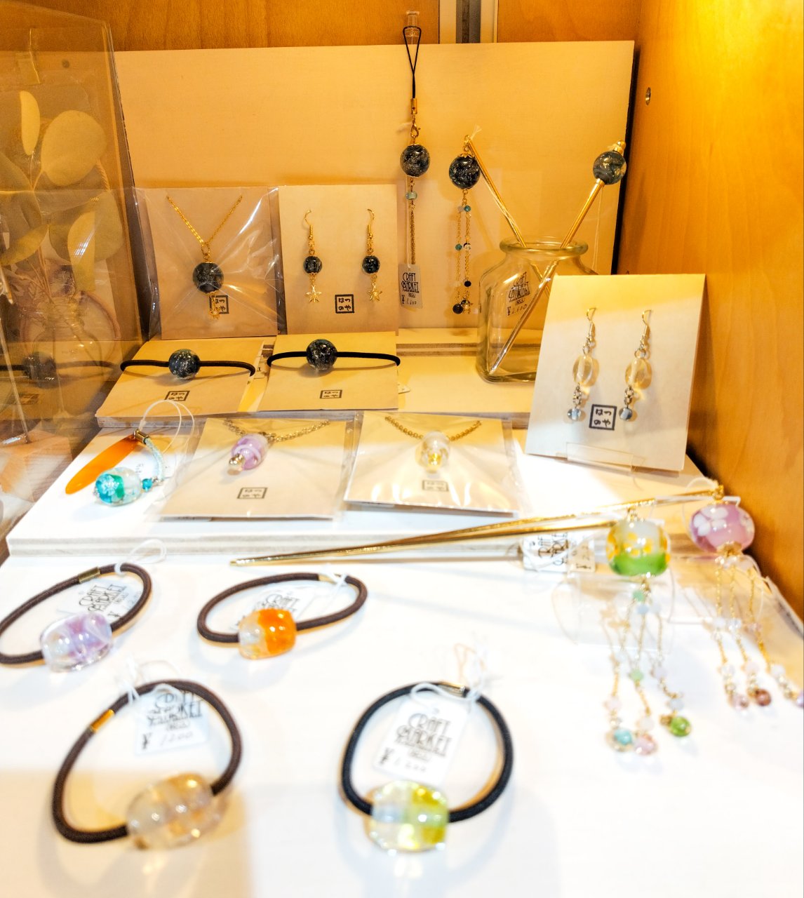 納品してきました Category:レンタルボックス Date:2024年03月28日 本日CRAFTMARKET様に追加納品してきました。 追加したのは5アイテム。 まずはヘアゴム2色。照明の関係でわかりづらいですが桜色と若草色です。春らしいカラーということで。 こちらは帯飾り。夏の浴衣にも合いそうな色合いです。 こちらは銀河のとんぼ玉シリーズでは初のピアス。このサイズで銀河のとんぼ玉が作れるだろうかと不安だったのですが、いい感じに可愛く仕上がりました。このほか春らしいカラーのとんぼ玉を単体で1つ納品しました。初納品から約1か月。どんなもんかとドキドキしながら行ってきましたが早速お手に取っていただけた作品もいくつかあり大変光栄です!展示作品を増やそうと右端にも板を入れて吊り棚を作るべくスペースを空けておいたのですが、いざ板を持って行ったらなんと入らず…帰り道にもう少し薄い板を買って帰ったのでした。来月こそは!にほんブログ村 [0回]PR